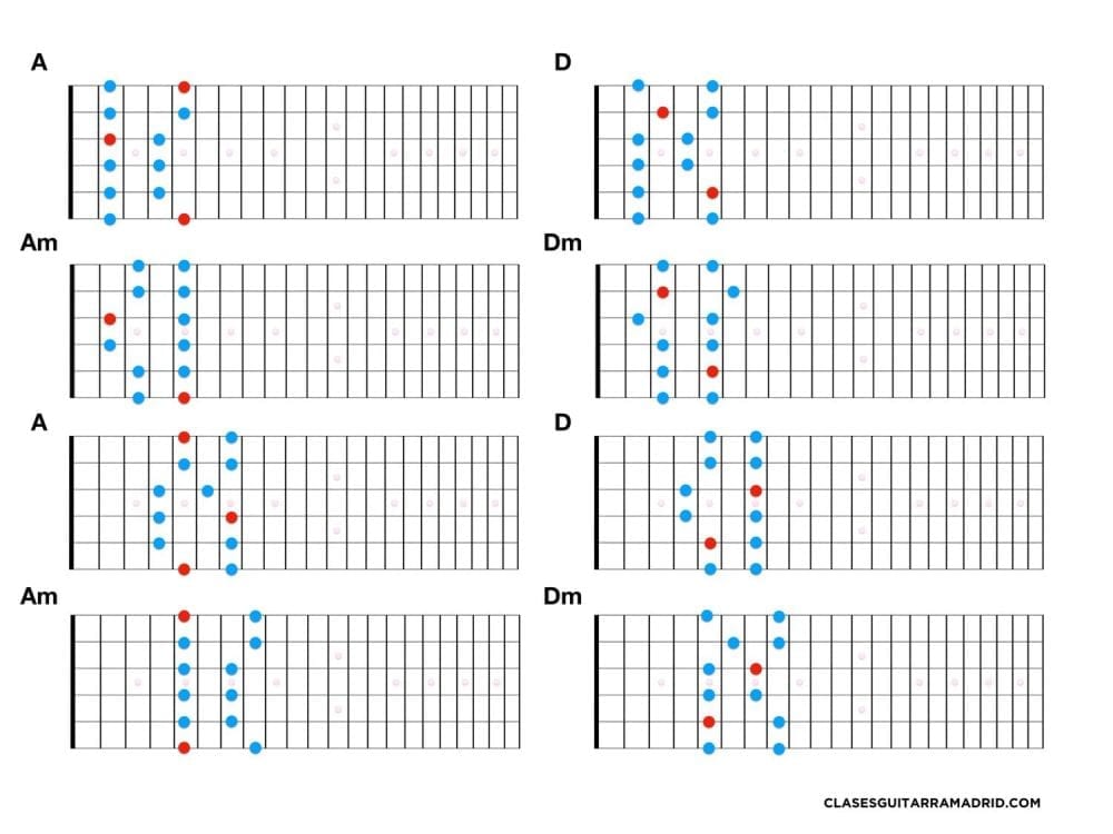 Es decir, tocas, por ejemplo, en el cuadrante 1 de la guitarra la escala Pentatónica de A acto seguido la de Am. Luego, en ese mismo cuadrante la mayor de D y la de Dm.