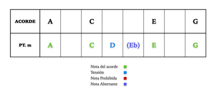 - La tercera menor de la escala es una nota «aberrante». Si la tocas sobre el acorde mayor —así como si nada—corres el peligro de que no te suene bien. No es una Tensión ni una Nota Prohibida. Es una mega tensión. Y no se puede tocar de cualquier manera…