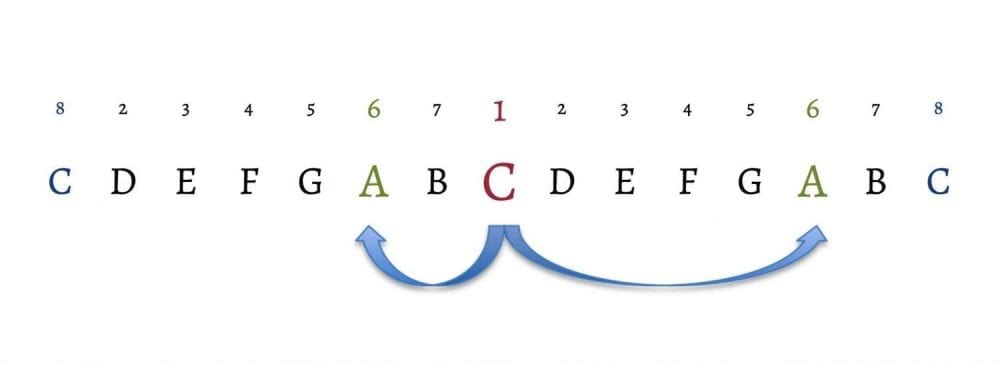 Si, como normalmente se hace, partimos de la tónica de la escala mayor —nota 1, raíz— la tónica de la tonalidad menor se encuentra a una 6ª mayor de distancia, es decir 4 tonos y ½ .