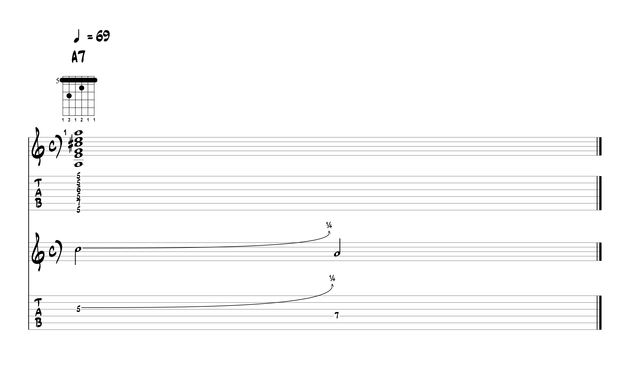 Lo que se suele hacer es pulsar esa nota, y automáticamente hacer un bending de tono completo para alcanzar la nota E, que es la 5ª del acorde de A7.