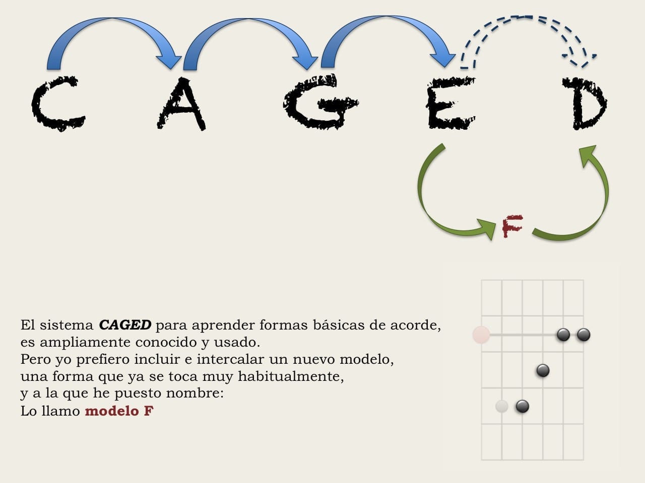 La disposición de los dedos en cada uno de los Modelos de acorde: C, A, G, E, D y el mío F, los puedes encontrar en muchos tutoriales sobre el sistema CAGED en Internet, así que ahora sigamos con el tema central