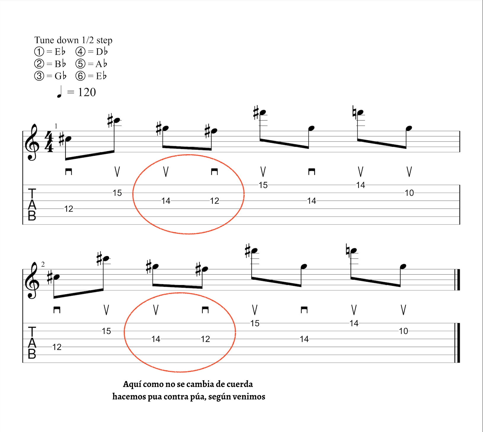 Para resumir, en una cuerda x, cambiamos el sentido de la púa dependiendo de dónde esté la siguiente cuerda que debamos tocar: Si está debajo, púa para abajo, si está arriba, púa para arriba.